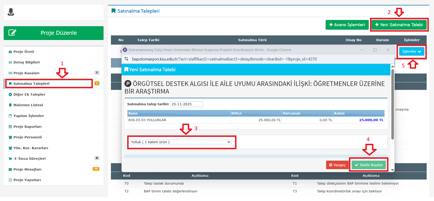 Proje yürütücüleri kongre/sempozyuma katılıp döndükten sonra öncelikle BAP Otomasyonda proje sayfasındaki işlem menüsünde "Satınalma Talepleri" kısmında yeni satınalma talebi ekle kısmından yolluk talep formunu oluşturarak e-imza ile onaylayarak göndermelidir. İşlemin ekran görüntüsü durunun altında yer almaktadır.